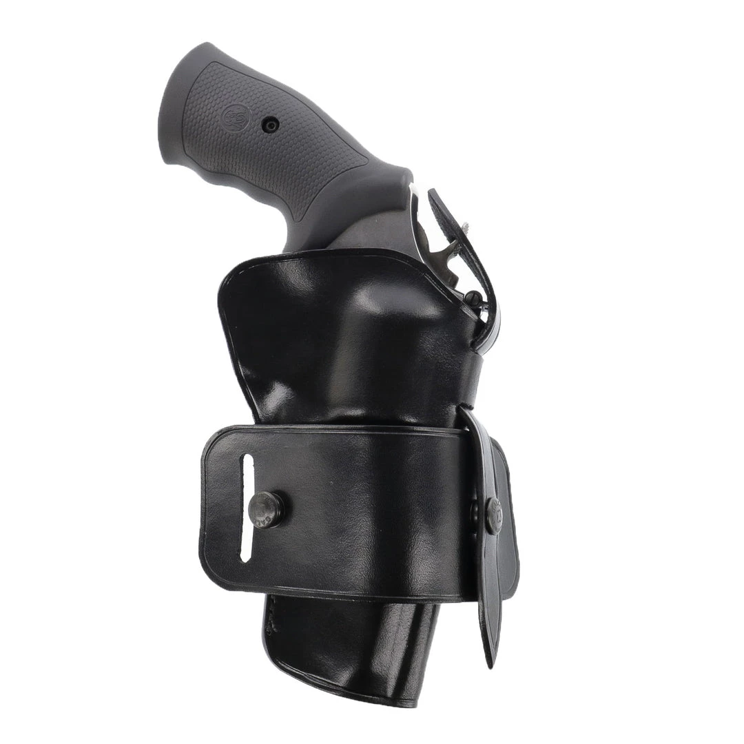 Fully ambidextrous, the WheelGunner allows right or left hand carry by unsnapping the holster from the belt slide, moving the belt slide to a different location on the belt, and reattaching the holster.