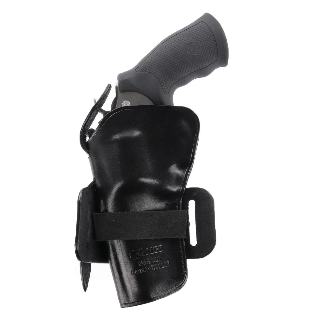 Constructed of premium steerhide, the ambidextrous WheelGunner fits belts up to 1 3/4” and is available for single- and double-action revolvers in tan or black color.